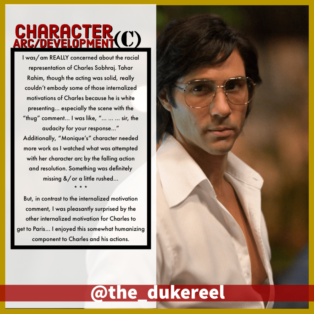 6. I was/am REALLY concerned about the racial representation of Charles Sobhraj. Tahar Rahim, though the acting was solid, really couldn’t embody some of those internalized motivations of Charles because he is white presenting… especially the scene with the “thug” comment… I was like, “… … … sir, the audacity for your response…” 👀🤦🏾♂️👎🏾