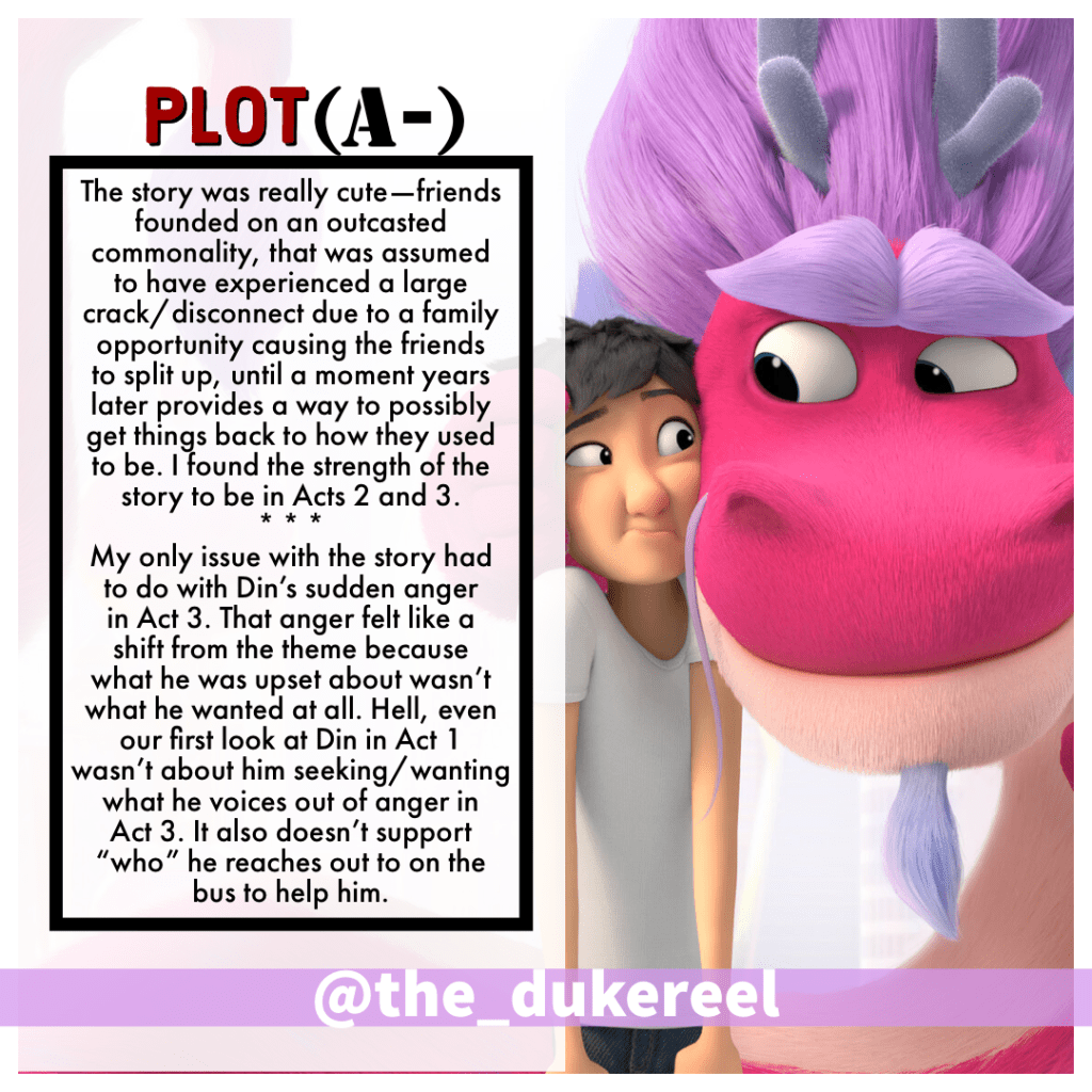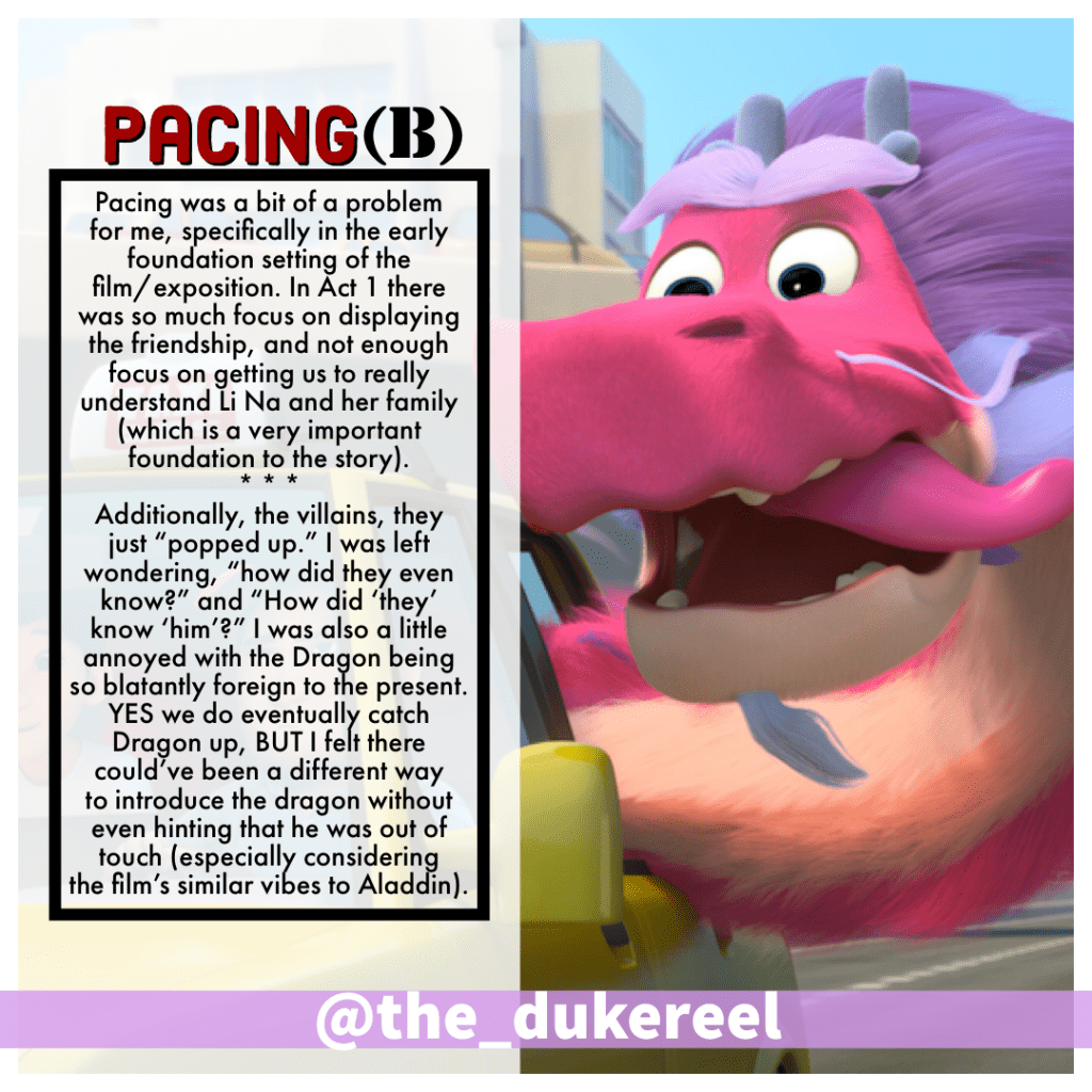 9. Pacing was a bit of a problem for me, specifically in the early foundation setting of the film/exposition. In Act 1 there was so much focus on displaying the friendship, and not enough focus on getting us to really understand Li Na and her family (which is a very important foundation to the story). Additionally, as mentioned with the villains, they just “popped up.” I was left wondering, “how did they even know?” and “How did ‘they’ know ‘him’?” I was also a little annoyed with the Dragon being so blatantly foreign to the present. YES we do eventually catch Dragon up, BUT I felt there could’ve been a different way to introduce the dragon without even hinting that he was out of touch (especially considering the films similar vibes to Aladdin). 👀