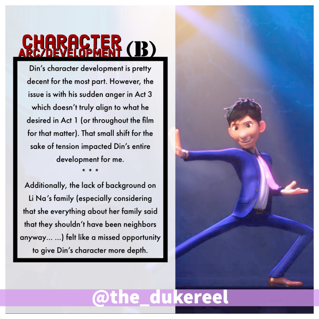13. Din’s character development is pretty decent for the most part. However, the issue is with his sudden anger in Act 3 which doesn’t truly align to what he desired in Act 1 (or throughout the film for that matter). That small shift for the sake of tension impacted Din’s entire development for me. Additionally, the lack of background on Li Na’s family (especially considering that she everything about her family said that they shouldn’t have been neighbors anyway… …) felt like a missed opportunity to give Din’s character more depth.🤔🤷🏾♂️