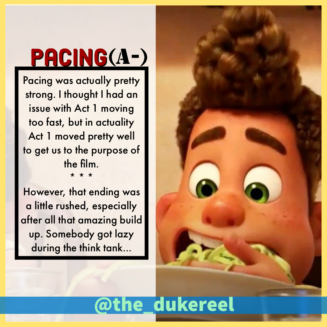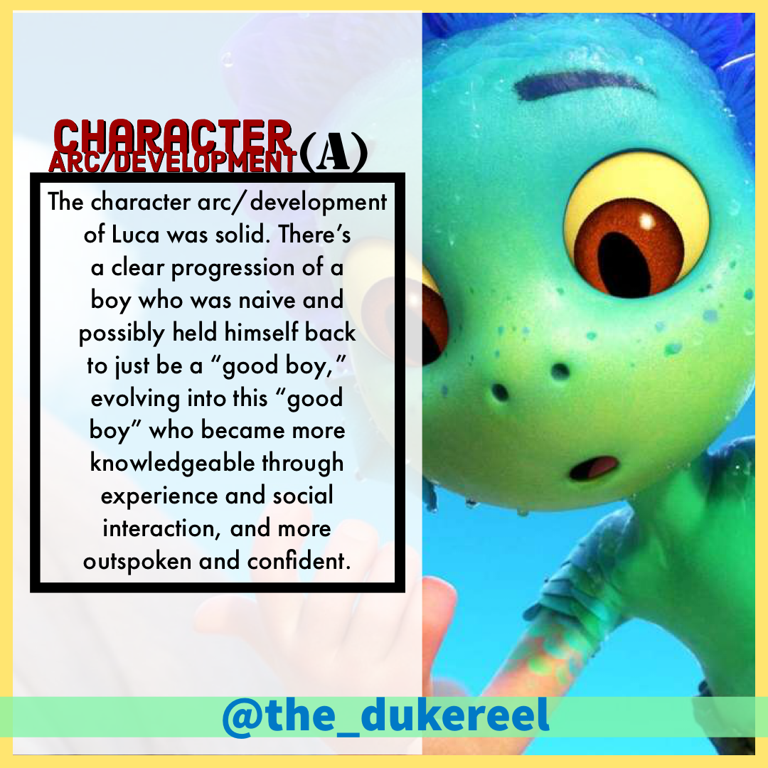 Below are my grades for key components in #Luca that I find to be key in any story/film/series—Theme, Plot, Pacing, and Character Arc/Development.