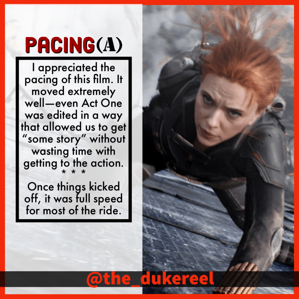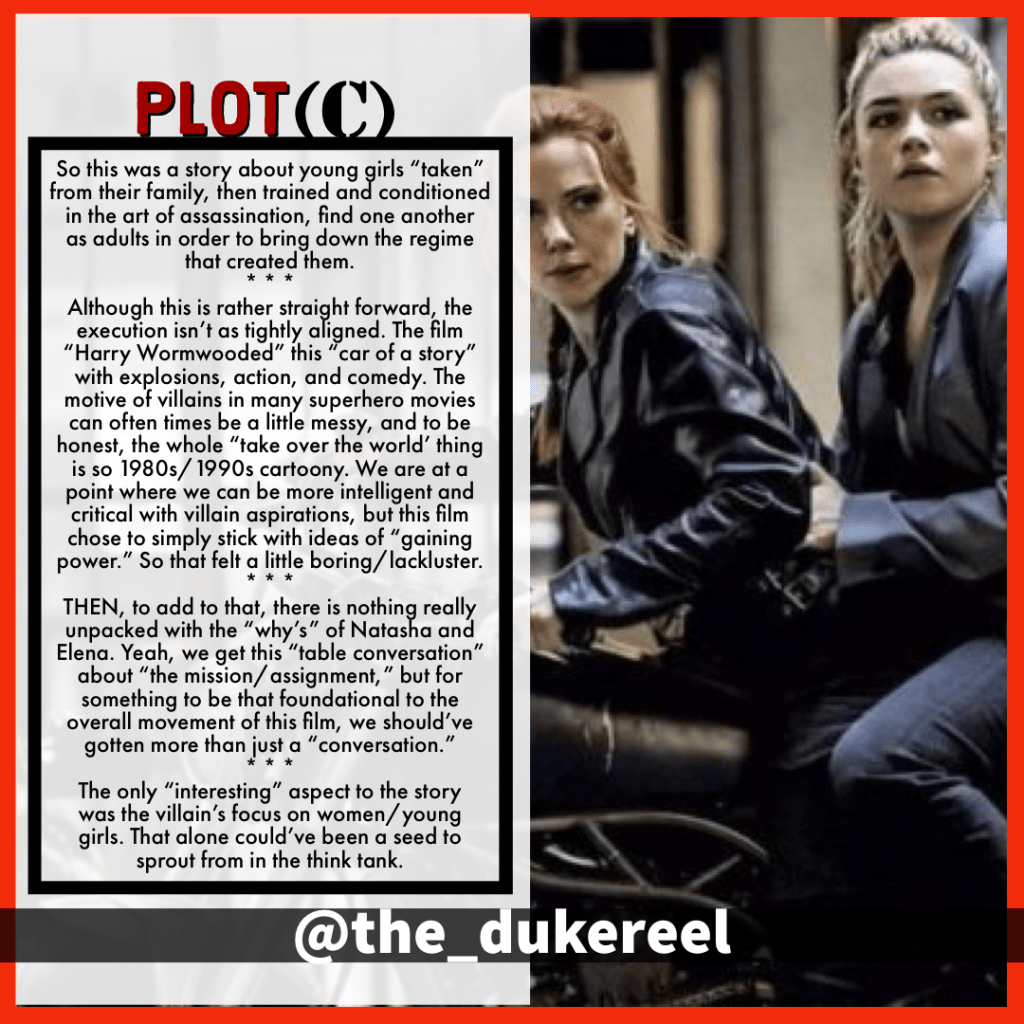 Below are my grades for key components in #BlackWidow that I find to be key in any story/film/series—Theme, Plot, Pacing, and Character Arc/Development.