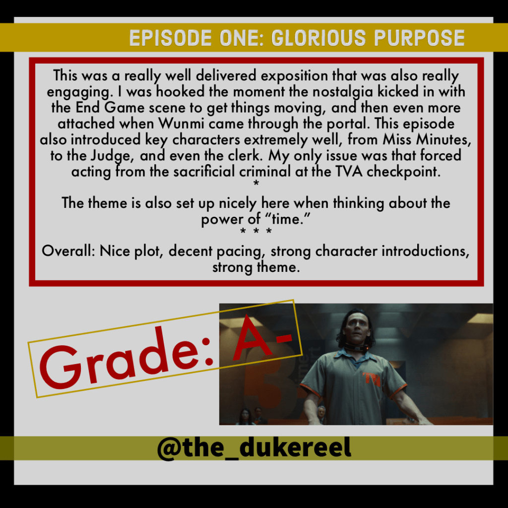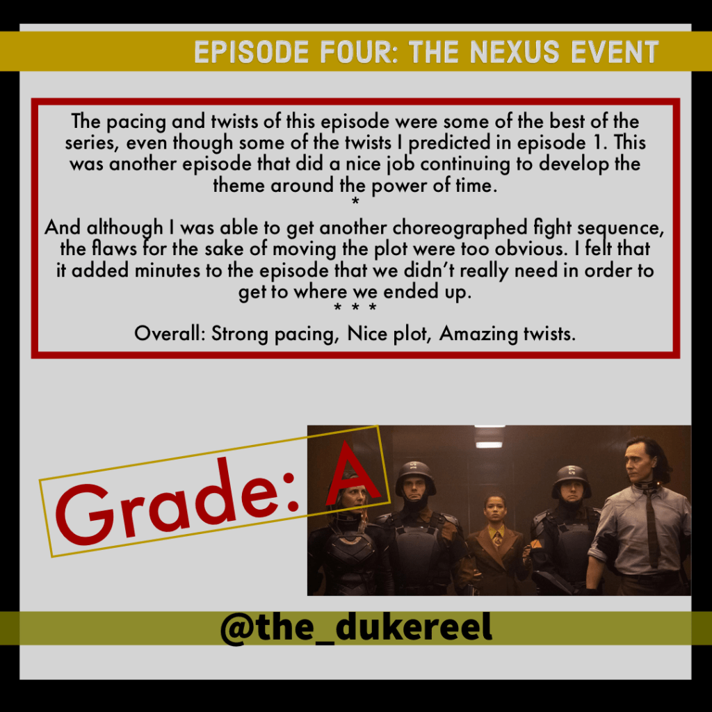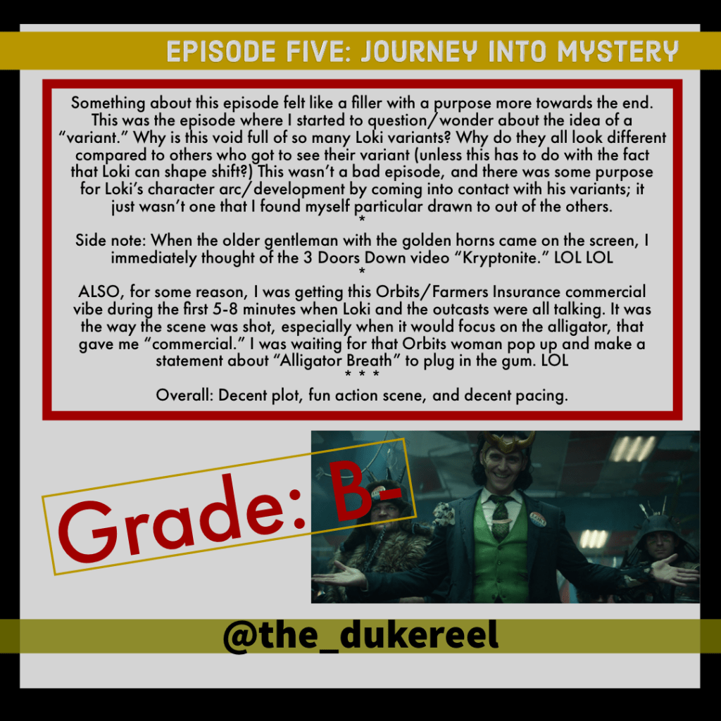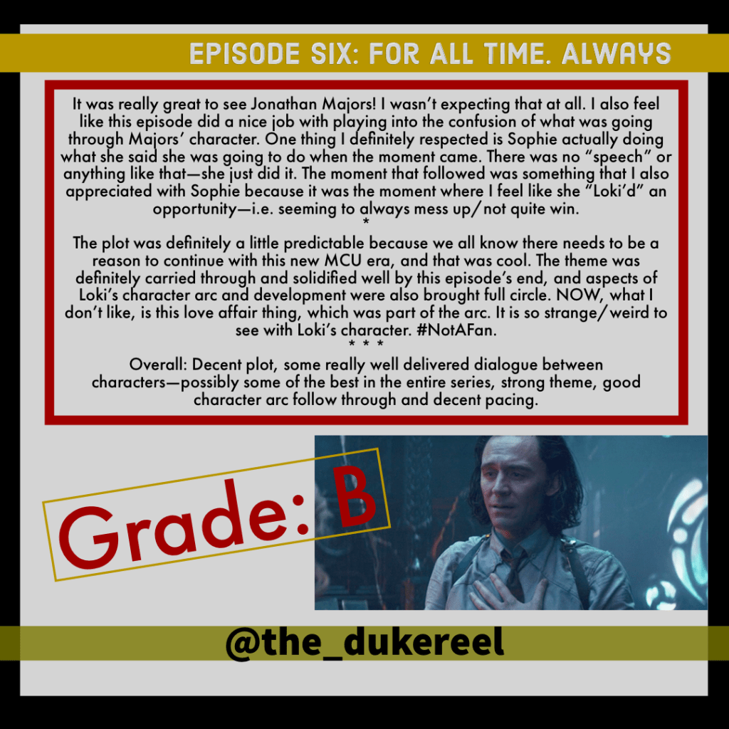 There was a lot I needed to process with this series. This could just be me, but when I think about Marvel, I go into the experience expecting smooth, seamlessly shot and edited fight choreography sequences, amazing graphics, and a pretty good story line. With Loki, episode after episode, I kept saying to myself, “This is a lot of conversation/information.” So as I looked at my notes for each episode, I was finding it hard to really give it simple praise despite walking away from the series liking it.