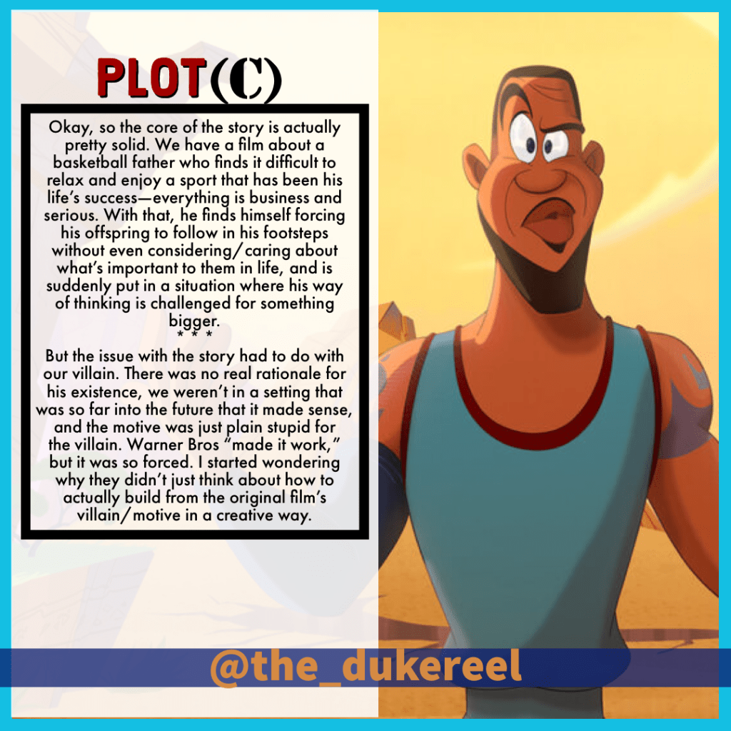 Below are my grades for key components in #SpaceJamANewLegacy that I find to be key in any story/film/series—Theme, Plot, Pacing, and Character Arc/Development.