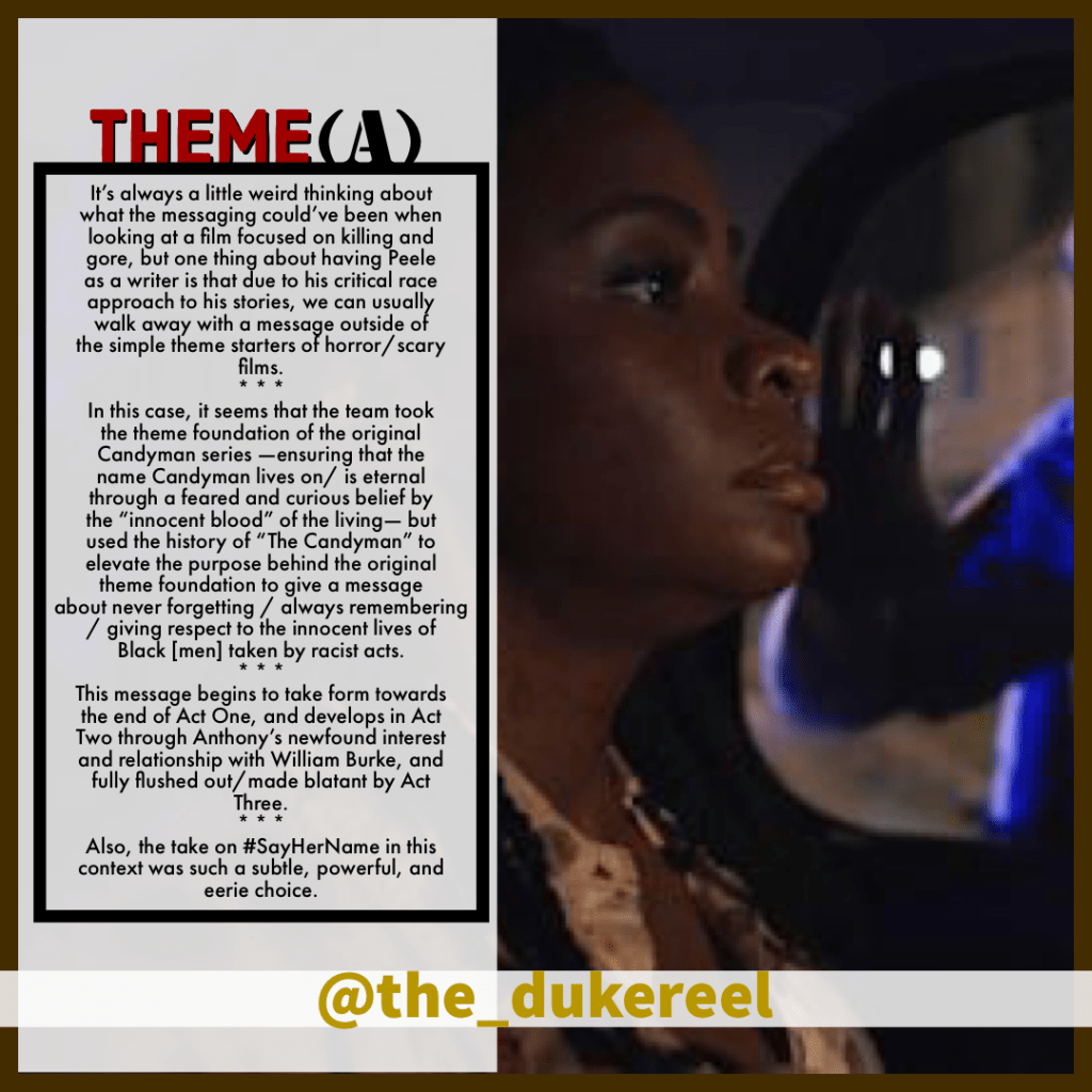 In this case, it seems that the team took the theme foundation of the original Candyman series —ensuring that the name Candyman lives on/ is eternal through a feared and curious belief by the “innocent blood” of the living— but used the history of “The Candyman” to elevate the purpose behind the original theme foundation to give a message about never forgetting / always remembering / giving respect to the innocent lives of Black [men] taken by racist acts.