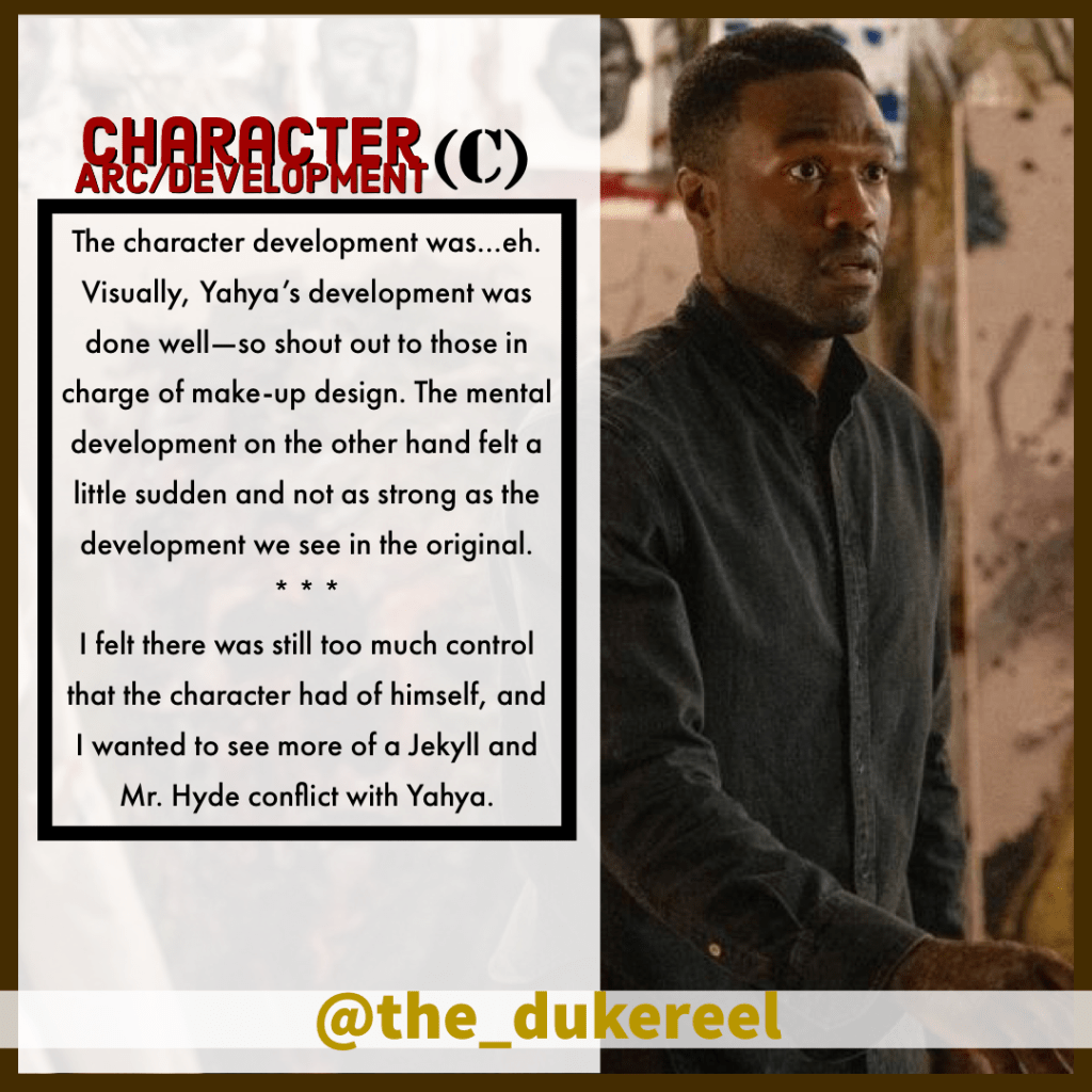 I felt there was still too much control that the character had of himself, and I wanted to see more of a Jekyll and Mr. Hyde conflict with Yahya. 🤷🏾♂️