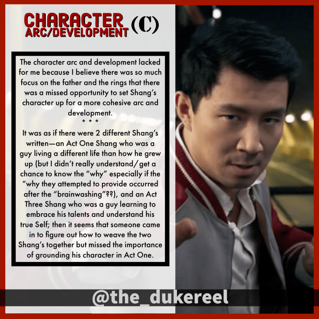 Below are my grades for key components in #Shangchi that I find to be key in any story/film/series—Theme, Plot, Pacing, and Character Arc/Development.