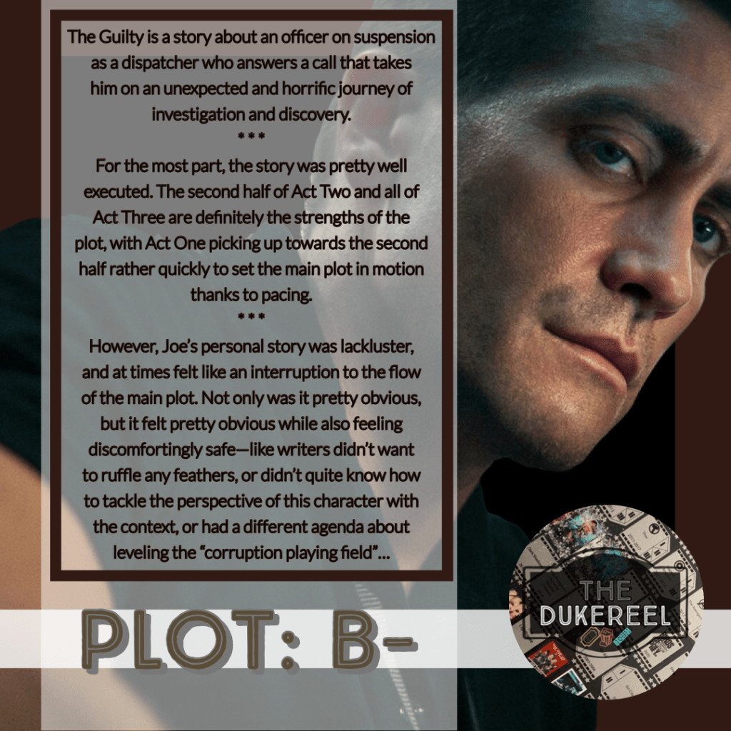 Below are my grades for key components in #TheGuilty that I find to be key in any story/film/series—Theme, Plot, Pacing, and Character Arc/Development.