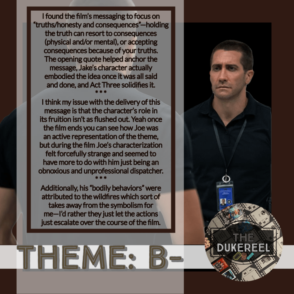 I think my issue with the delivery of this message is that the character’s role in its fruition isn’t as flushed out. Yeah once the film ends you can see how Joe was an active representation of the theme, but during the film Joe’s characterization felt forcefully strange and seemed to have more to do with him just being an obnoxious and unprofessional dispatcher. Additionally, his “bodily behaviors” were attributed to the wildfires which sort of takes away from the symbolism for me—I’d rather they just let the actions just escalate over the course of the film. 🤷🏾♂️