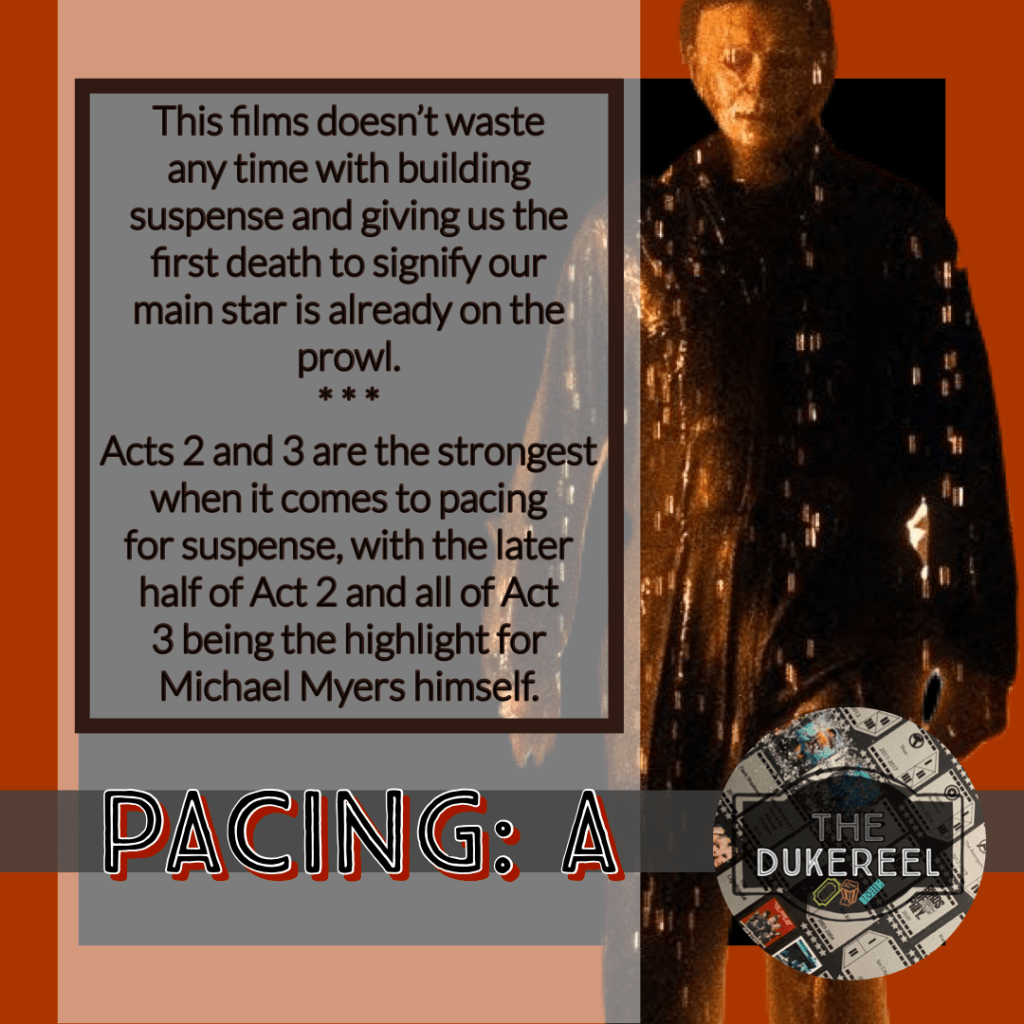 5. This films doesn’t waste any time with building suspense and giving us the first death to signify our main star is already on the prowl. Acts 2 and 3 are the strongest when it comes to pacing for suspense, with the later half of Act 2 and all of Act 3 being the highlight for Michael Myers himself. 👍🏾
