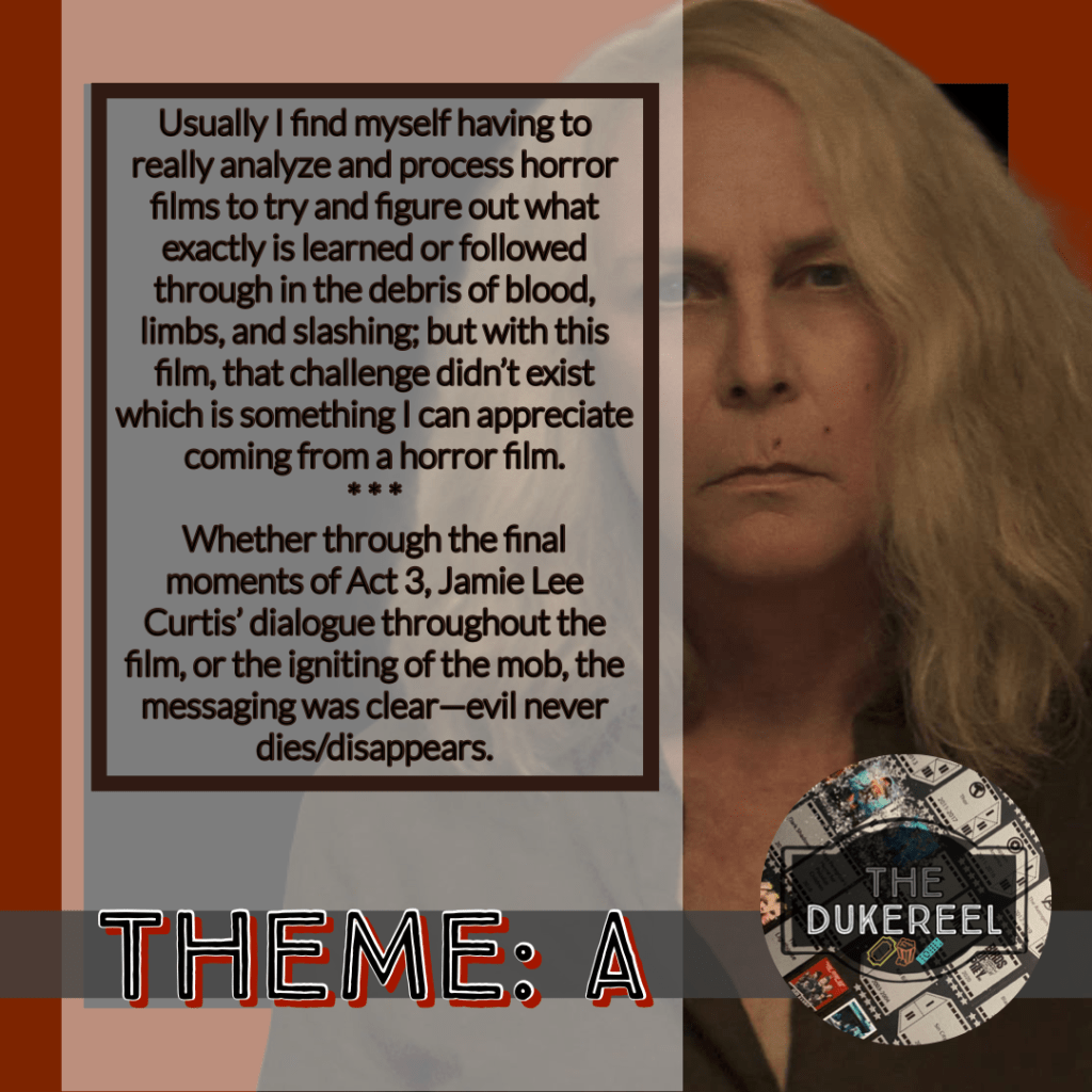 Whether through the final moments of Act 3, Jamie Lee Curtis’ dialogue throughout the film, or the igniting of the mob, the messaging was clear—evil never dies/disappears. 👏🏾👏🏾👏🏾