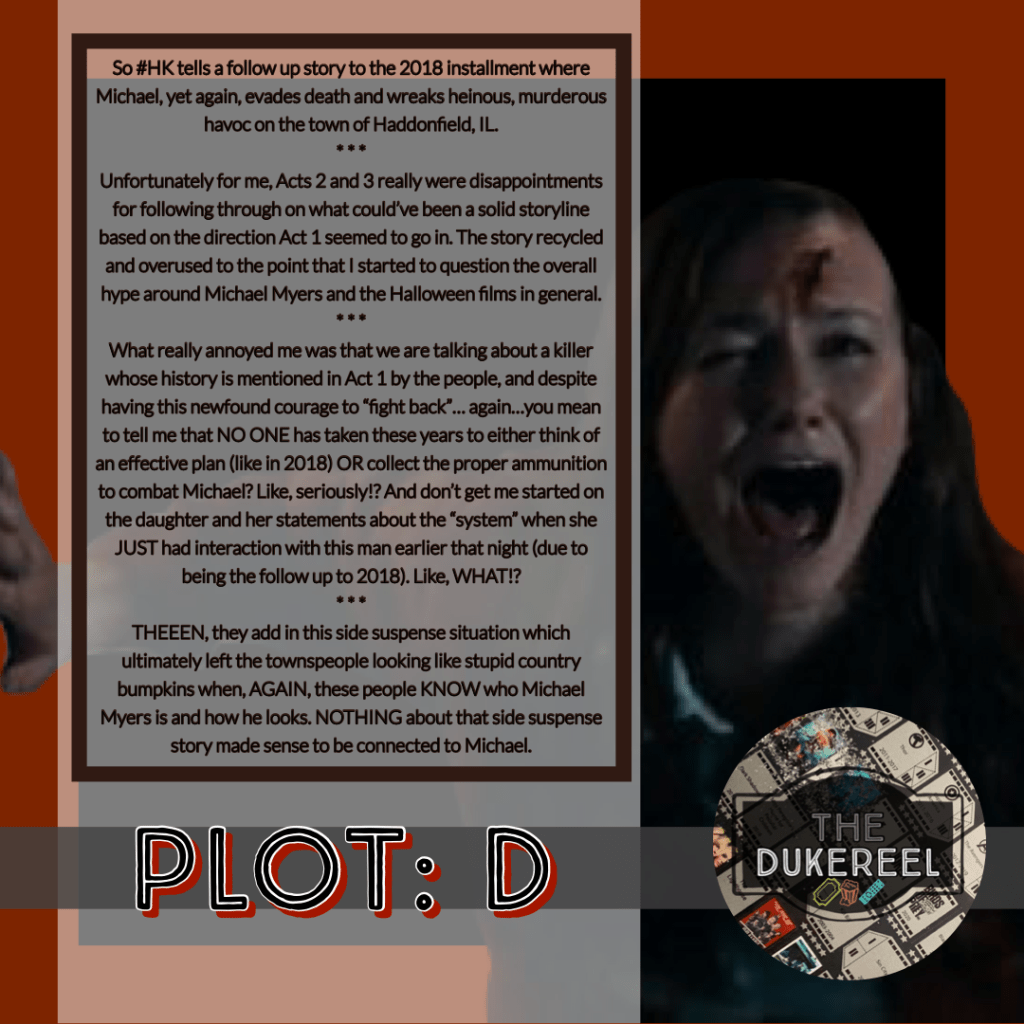 What really annoyed me was that we are talking about a killer whose history is mentioned in Act 1 by the people, and despite having this newfound courage to “fight back”… again…you mean to tell me that NO ONE has taken these years to either think of an effective plan (like in 2018) OR collect the proper ammunition to combat Michael? Like, seriously!? And don’t get me started on the daughter and her statements about the “system” when she JUST had interaction with this man earlier that night (due to being the follow up to 2018). Like, WHAT!?