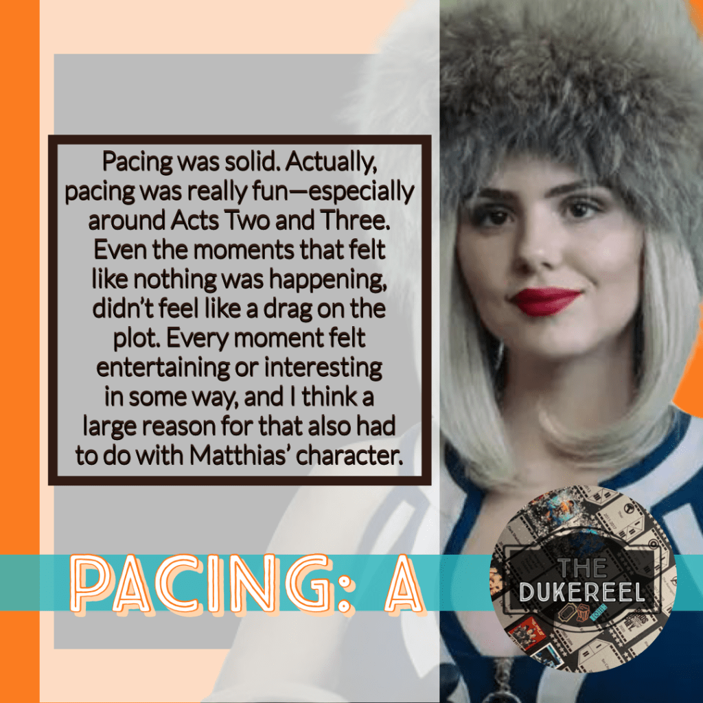 8. Pacing was solid. Actually, pacing was really fun—especially around Acts Two and Three. Even the moments that felt like nothing was happening, didn’t feel like a drag on the plot. Every moment felt entertaining or interesting in some way, and I think a large reason for that also had to do with Matthias’ character. 👏🏾👏🏾👏🏾👍🏾
