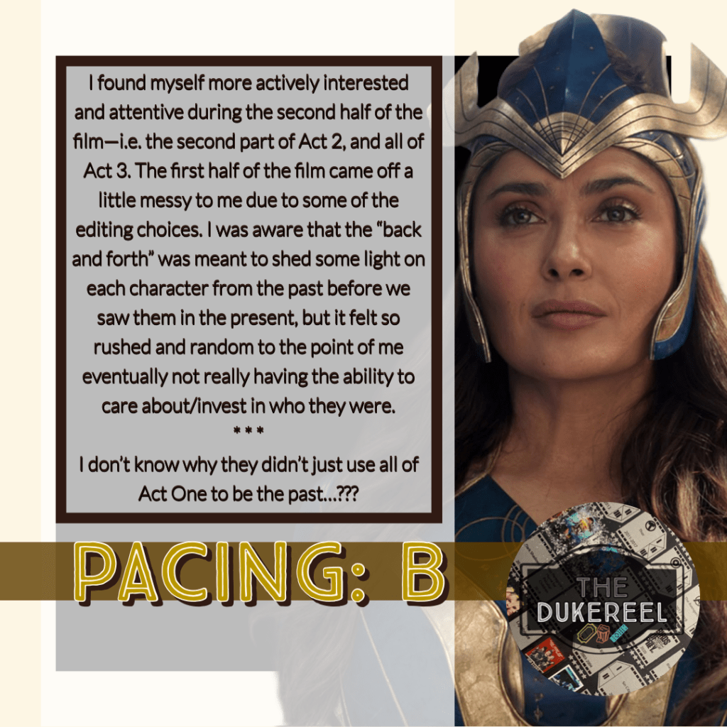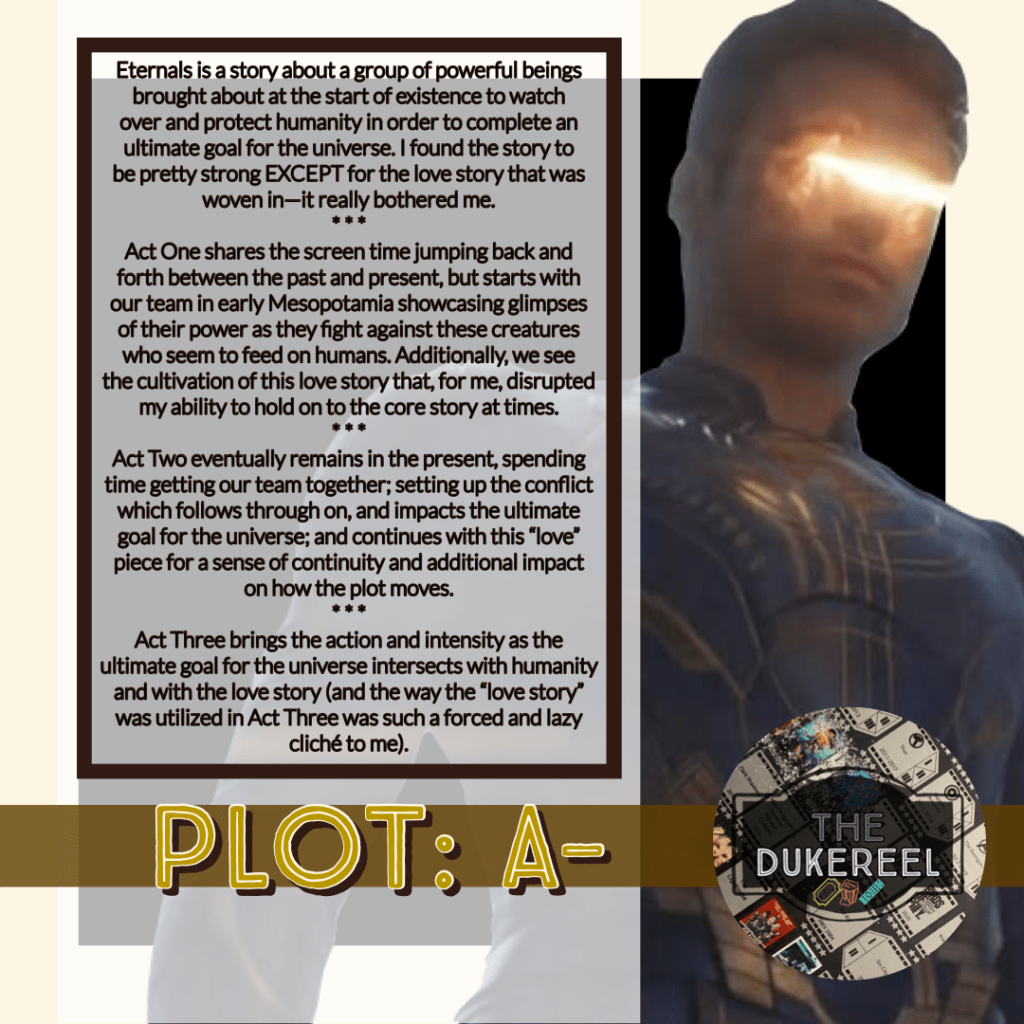 Below are my grades for key components in #Eternals that I find to be key in any story/film/series—Theme, Plot, Pacing, and Character (pertaining to arc/development &/or delivery). FYI: My A=95, A- =90, B=85, B-=80…etc. My D- =60 and my F=50