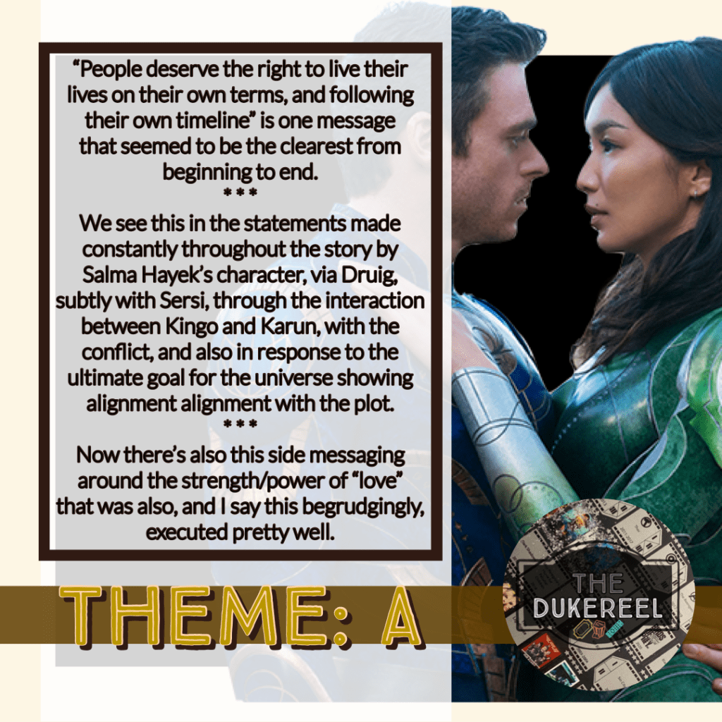 We see this in the statements made constantly throughout the story by Salma Hayek’s character, via Druig, subtly with Sersi, through the interaction between Kingo and Karun, with the conflict, and also in response to the ultimate goal for the universe showing alignment alignment with the plot.