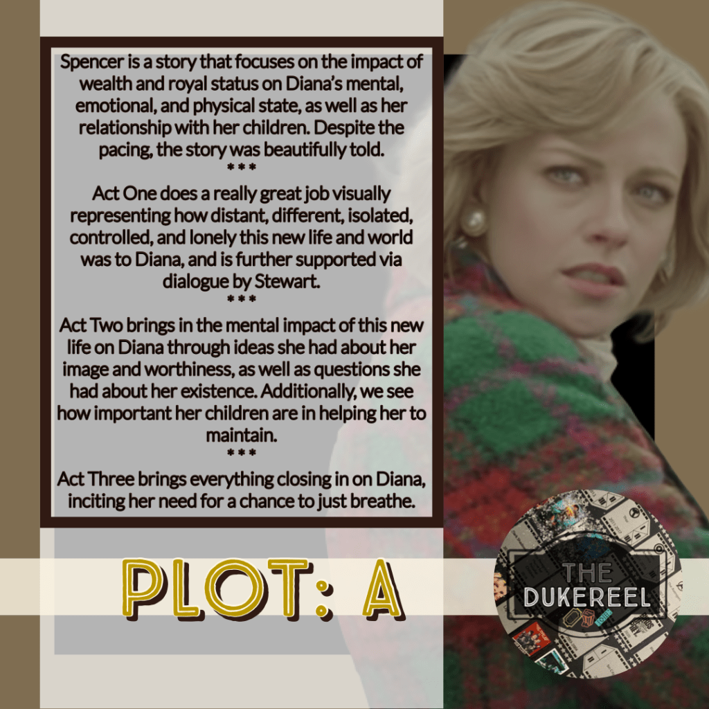 Below are my grades for key components in #Spencer that I find to be key in any story/film/series—Theme, Plot, Pacing, and Character (pertaining to arc/development &/or delivery). FYI: My A=95, A- =90, B=85, B-=80…etc. My D- =60 and my F=50