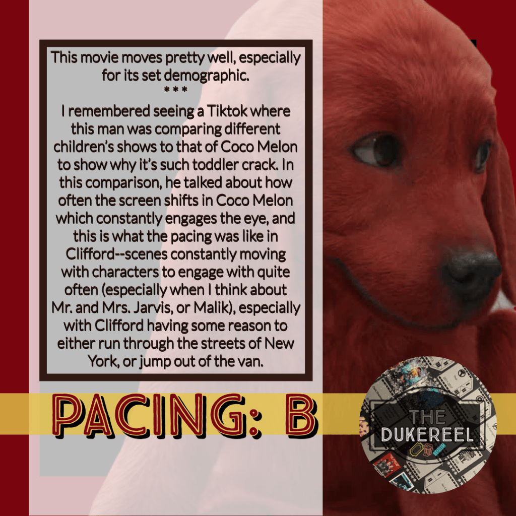 I remembered seeing a Tiktok where this man was comparing different children’s shows to that of Coco Melon to show why it’s such toddler crack. In this comparison, he talked about how often the screen shifts in Coco Melon which constantly engages the eye, and this is what the pacing was like in Clifford–scenes constantly moving with characters to engage with quite often (especially when I think about Mr. and Mrs. Jarvis, or Malik), especially with Clifford having some reason to either run through the streets of New York, or jump out of the van.