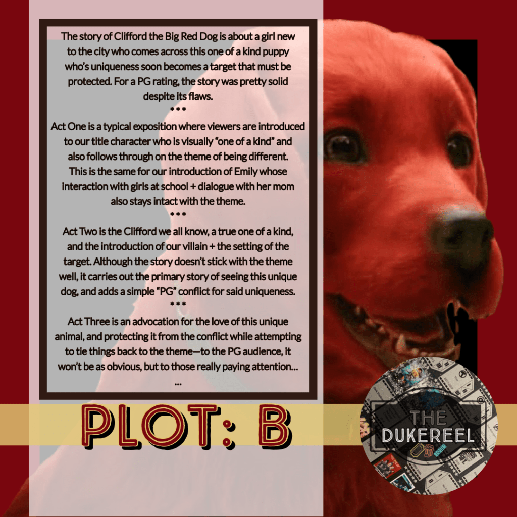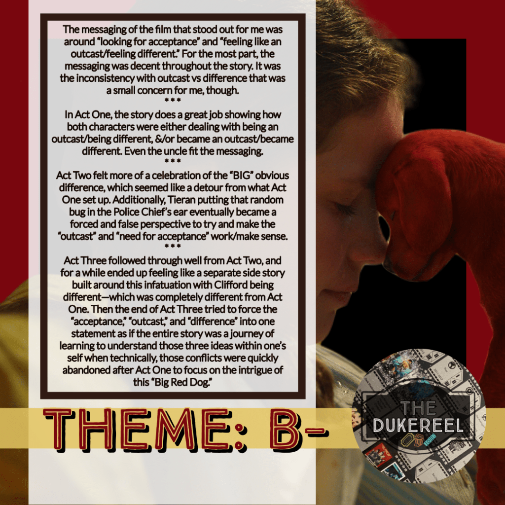 Below are my grades for key components in #CliffordTheBigRedDog that I find to be key in any story/film/series—Theme, Plot, Pacing, and Character (pertaining to arc/development &/or delivery). FYI: My A=95, A- =90, B=85, B-=80…etc. My D- =60 and my F=50