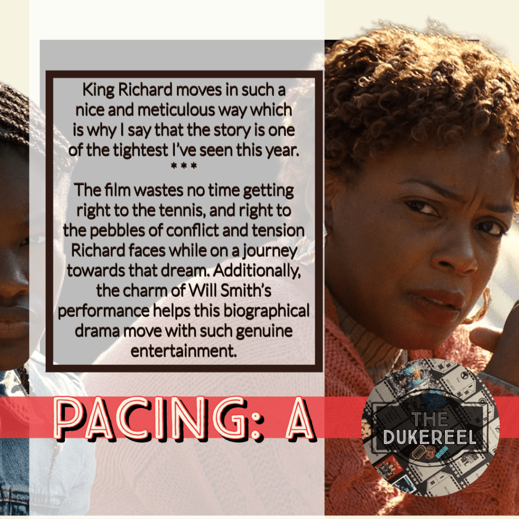 Below are my grades for key components in #KingRichard that I find to be key in any story/film/series—Theme, Plot, Pacing, and Character (pertaining to arc/development &/or delivery). FYI: My A=95, A- =90, B=85, B-=80…etc. My D- =60 and my F=50