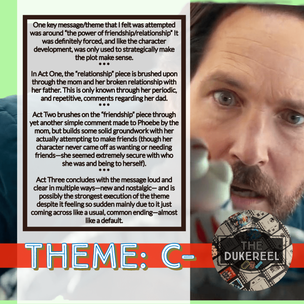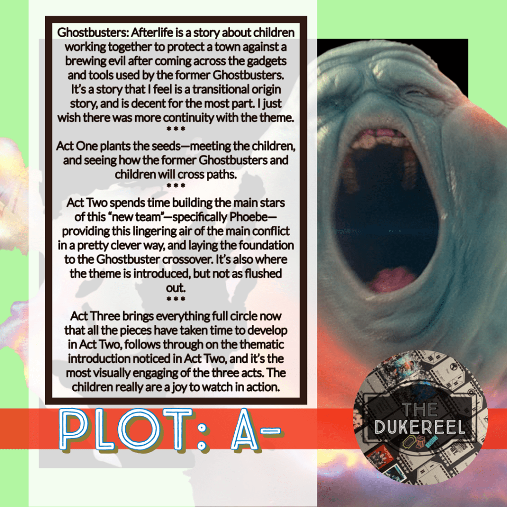 Below are my grades for key components in #GhostbustersAfterLife that I find to be key in any story/film/series—Theme, Plot, Pacing, and Character (pertaining to arc/development &/or delivery). FYI: My A=95, A- =90, B=85, B-=80…etc. My D- =60 and my F=50