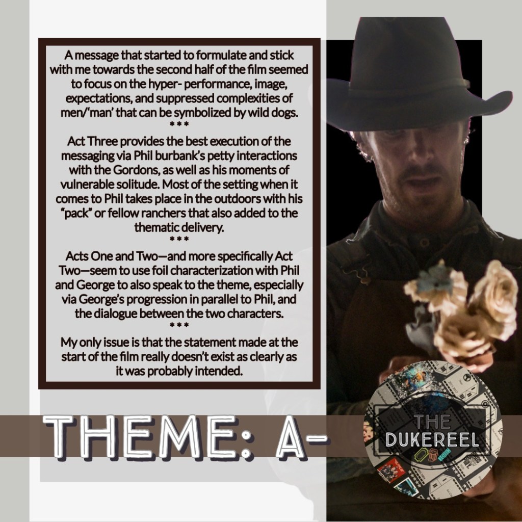 Below are my grades for key components in #ThePowerOfTheDog that I find to be key in any story/film/series—Theme, Plot, Pacing, and Character (pertaining to arc/development &/or delivery). FYI: My A=95, A- =90, B=85, B-=80…etc. My D- =60 and my F=50