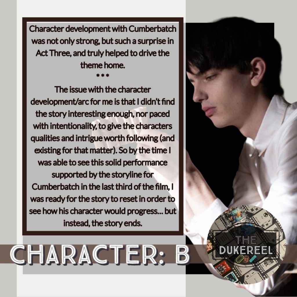 The issue with the character development/arc for me is that I didn’t find the story interesting enough, nor paced with intentionality, to give the characters qualities and intrigue worth following (and existing for that matter). So by the time I was able to see this solid performance supported by the storyline for Cumberbatch in the last third of the film, I was ready for the story to reset in order to see how his character would progress… but instead, the story ends.