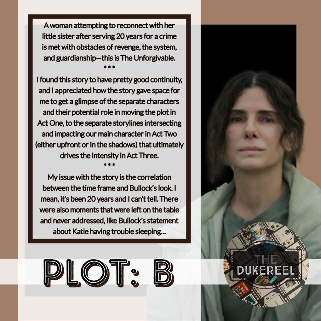 Below are my grades for key components in #TheUnforgivable that I find to be key in any story/film/series—Theme, Plot, Pacing, and Character (pertaining to arc/development &/or delivery). FYI: My A=95, A- =90, B=85, B-=80…etc. My D- =60 and my F=50