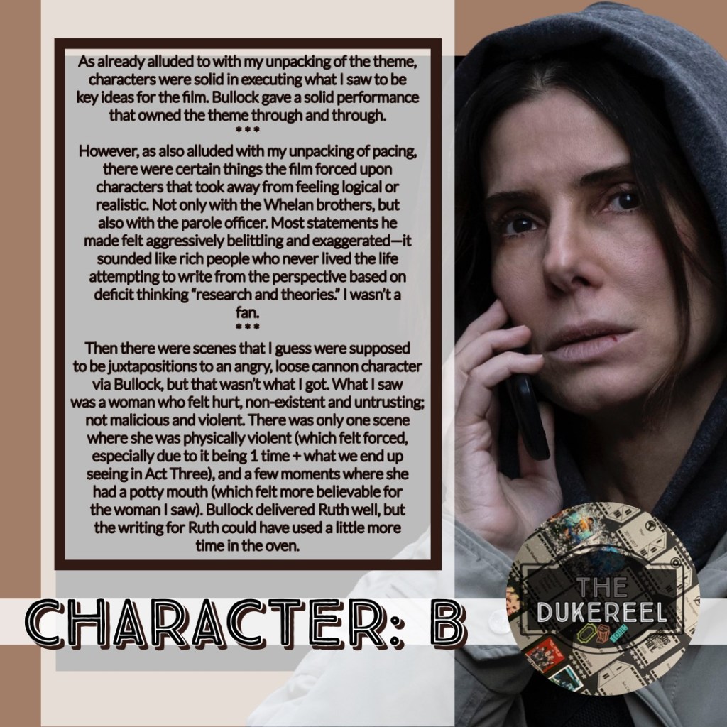 Then there were scenes that I guess were supposed to be juxtapositions to an angry, loose cannon character via Bullock, but that wasn’t what I got. What I saw was a woman who felt hurt, non-existent and untrusting; not malicious and violent. There was only one scene where she was physically violent (which felt forced, especially due to it being 1 time + what we end up seeing in Act Three), and a few moments where she had a potty mouth (which felt more believable for the woman I saw). Bullock delivered Ruth well, but the writing for Ruth could have used a little more time in the oven. 🥴