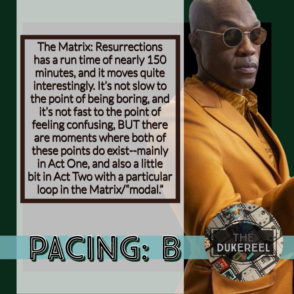 9. The Matrix: Resurrections has a run time of nearly 150 minutes, and it moves quite interestingly. It’s not slow to the point of being boring, and it’s not fast to the point of feeling confusing, BUT there are moments where both of these points do exist–mainly in Act One, and also a little bit in Act Two with a particular loop in the Matrix/“modal.” 🤷🏾♂️