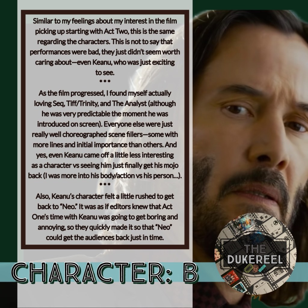 Also, Keanu’s character felt a little rushed to get back to “Neo.” It was as if editors knew that Act One’s time with Keanu was going to get boring and annoying, so they quickly made it so that “Neo” could get the audiences back just in time. 🤷🏾♂️