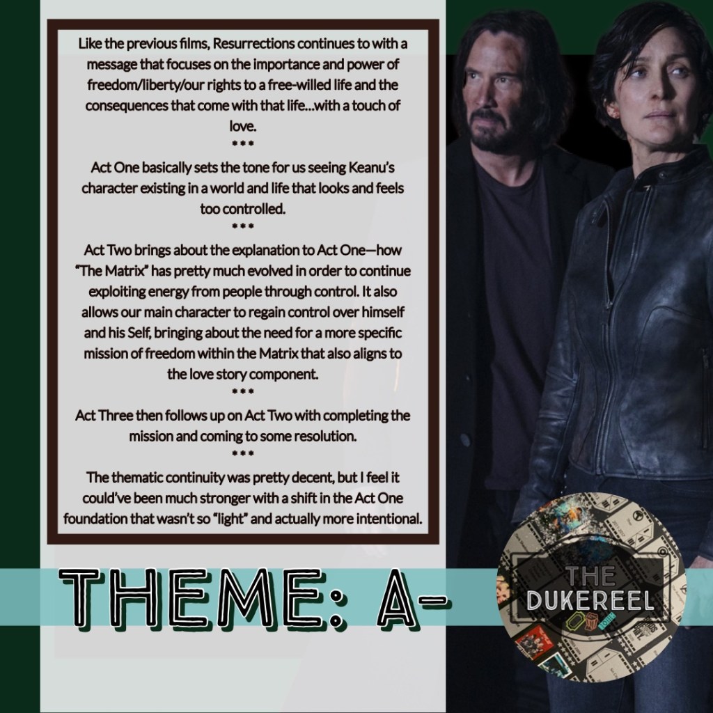Below are my grades for key components in #MatrixRessurections that I find to be key in any story/film/series—Theme, Plot, Pacing, and Character (pertaining to arc/development &/or delivery). FYI: My A=95, A- =90, B=85, B-=80…etc. My D- =60 and my F=50