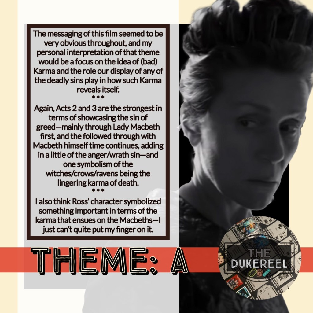 Below are my grades for key components in #TheTragedyOfMacbeth that I find to be key in any story/film/series—Theme, Plot, Pacing, and Character (pertaining to arc/development &/or delivery). FYI: My A=95, A- =90, B=85, B-=80…etc. My D- =60 and my F=50