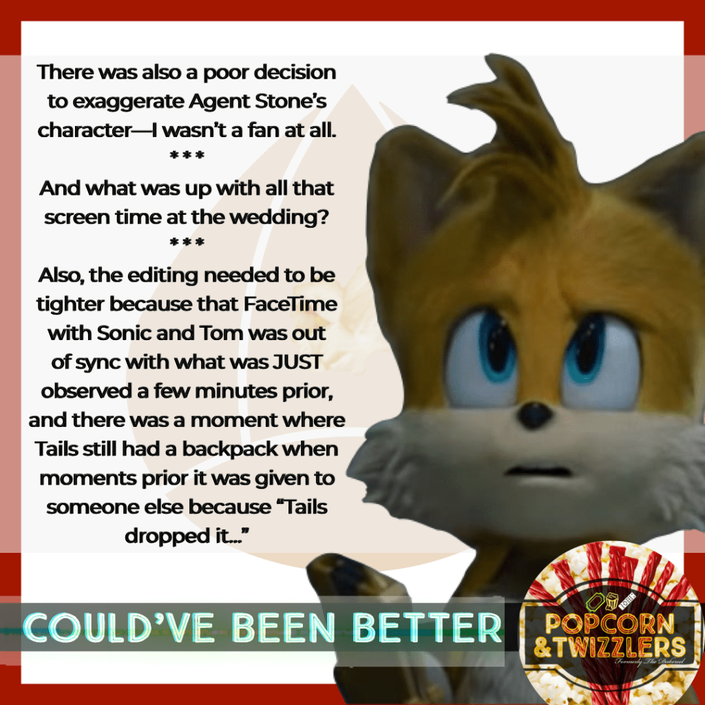 3. What is up with the editing? The phone call between Sonic and Tom seemed out of order (like, Sonic already knew when you got there…), and then there was a moment where Tails had his backpack and then didn’t have his backpack within a 3-5 second frame. 🤦🏾♂️