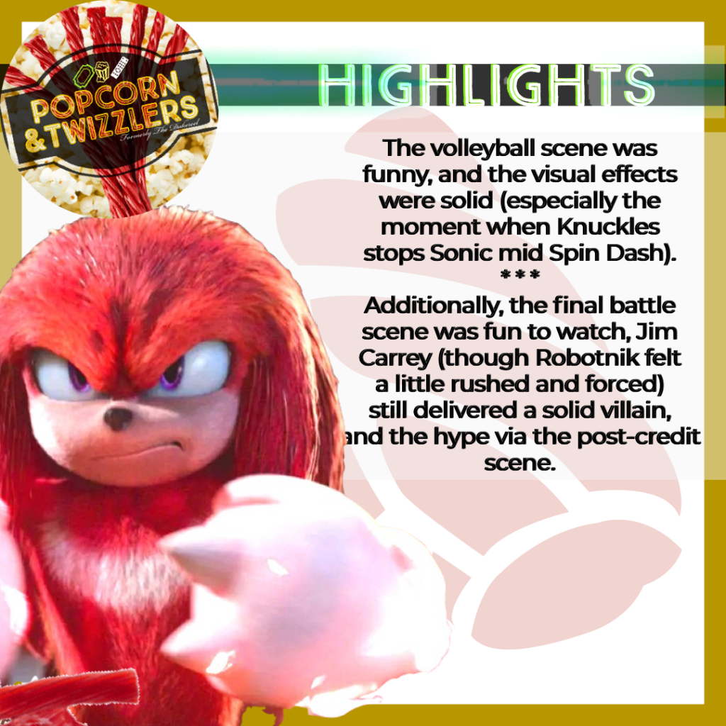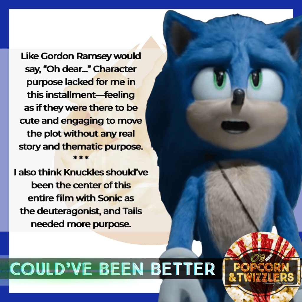 Personally, I think this film should’ve never centered Sonic. It should’ve centered Knuckles with Sonic as a deuteragonist, and this should actually be the case for every Sonic film moving forward until all the key characters have had their “origin story,” and then create a film where they all work together. There was just too many things attempting to be covered in this installment, like what is the rush?