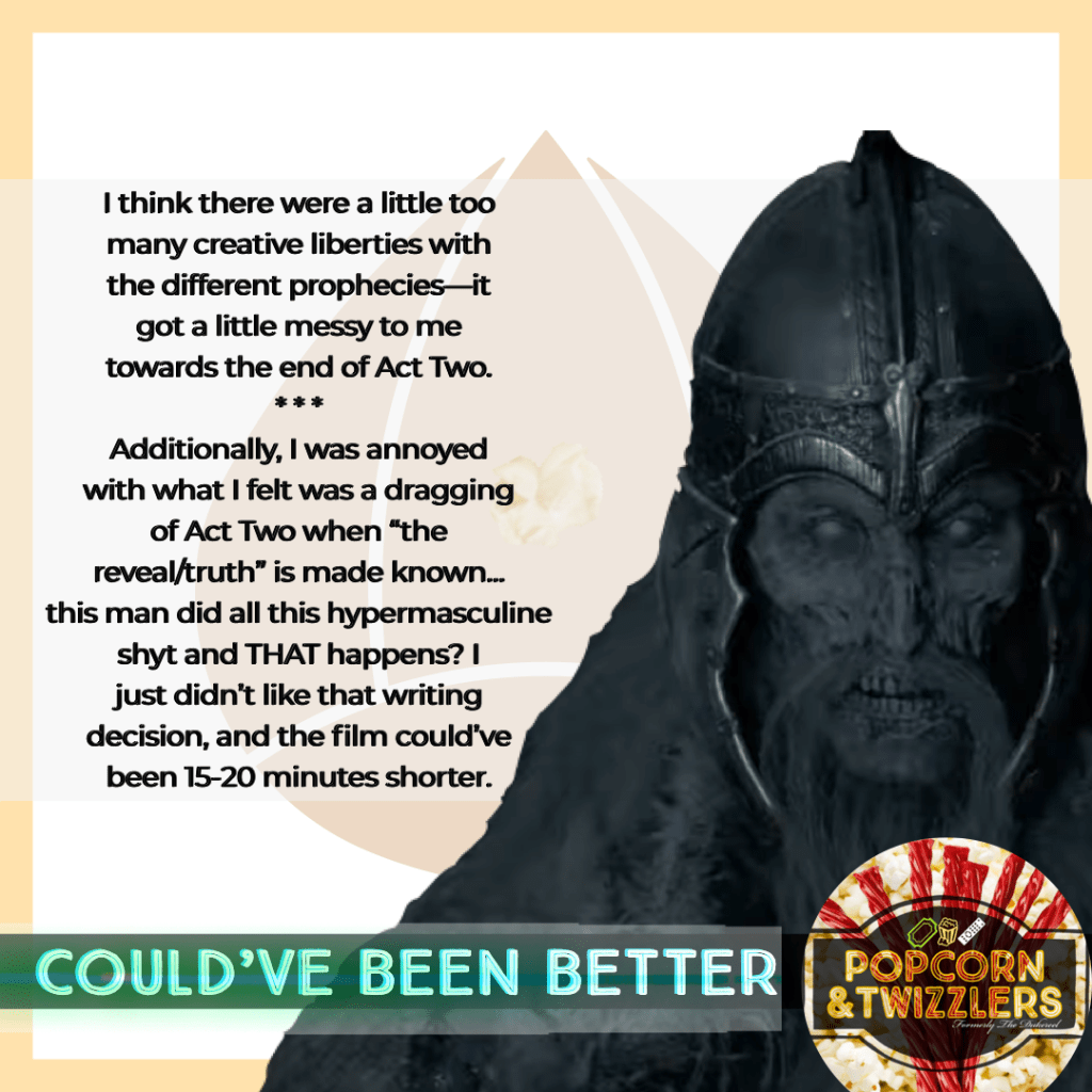 9. The Northman has a runtime of about 127 minutes, and I didn’t really “feel it” until a few minutes into Act Three. And it wasn’t a frustrated realization, but there was a moment that annoyed me with Amleth and the story when the “reveal” is made, and I was like… “why!?” This man talked all this stuff, and THIS happens? Because of “that” one observation? It just felt dragged out for no reason…in addition to the “over-adding” of the prophecy elements. 🤷🏾♂️