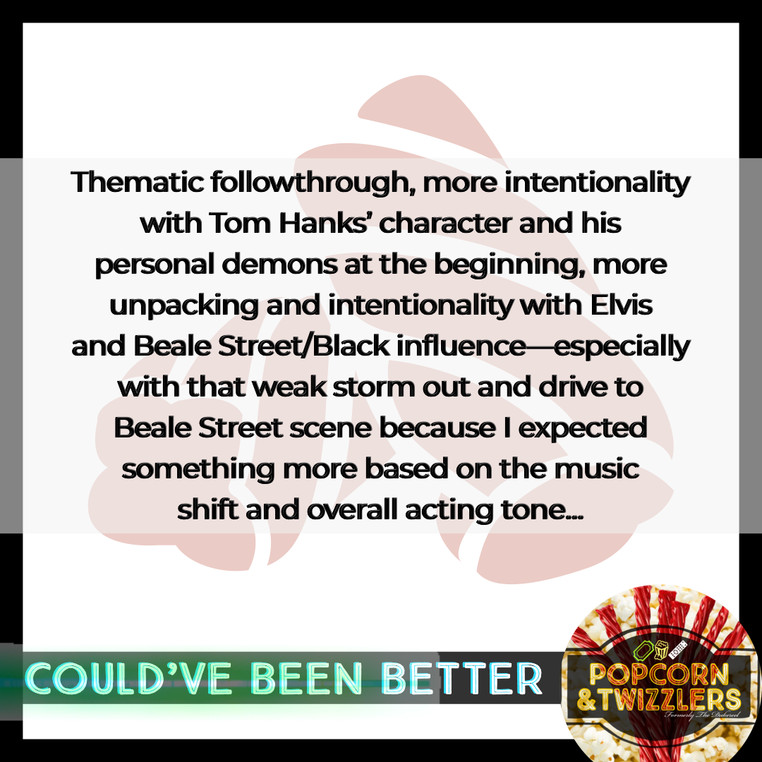 Act Three is another really engaging act, and a nice conclusion to the film overall. It’s also where the theme is the strongest via Hanks’ character. Almost blatant. Now in terms of Elvis’ character, again he came off as an entertainment pawn for me vs having a real purpose and connection to the theme. 🥴