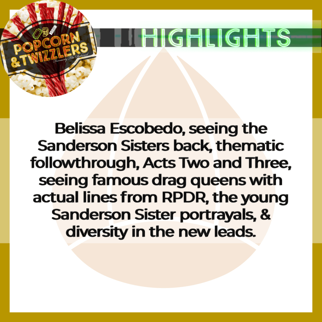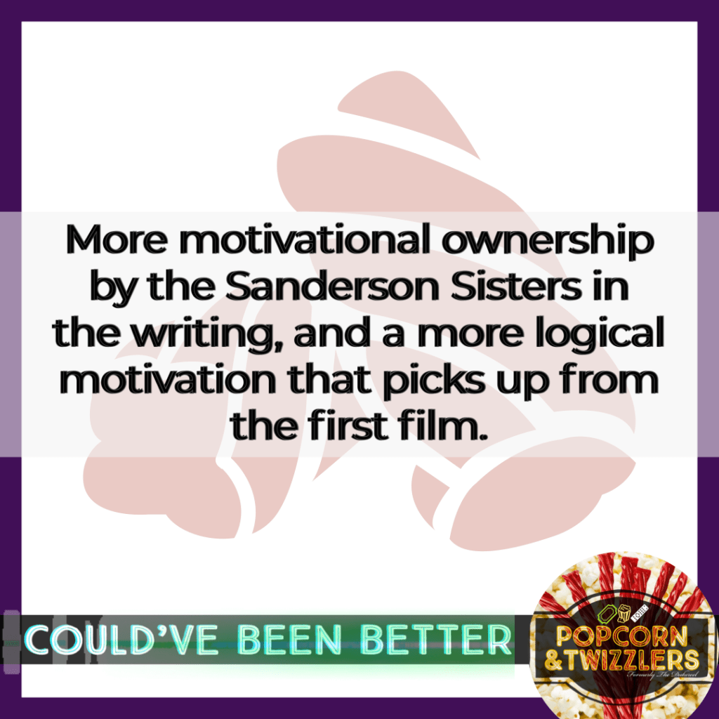 The strength of the story for me were Acts Two and Three. It’s where the bulk of the nostalgia lived for me, and blending of the Sanderson Sisters and Becca’s crew blended well with intentional engagement and entertainment. 👍🏾