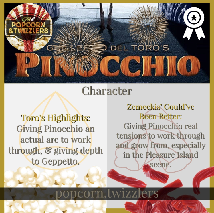 The setting. The backstory to Geppetto’s son. The more “realistic” adaptation to the Pleasure Island climax of the original. And the overall production and storytelling medium. All things that should be admired and given due props, in my opinion.