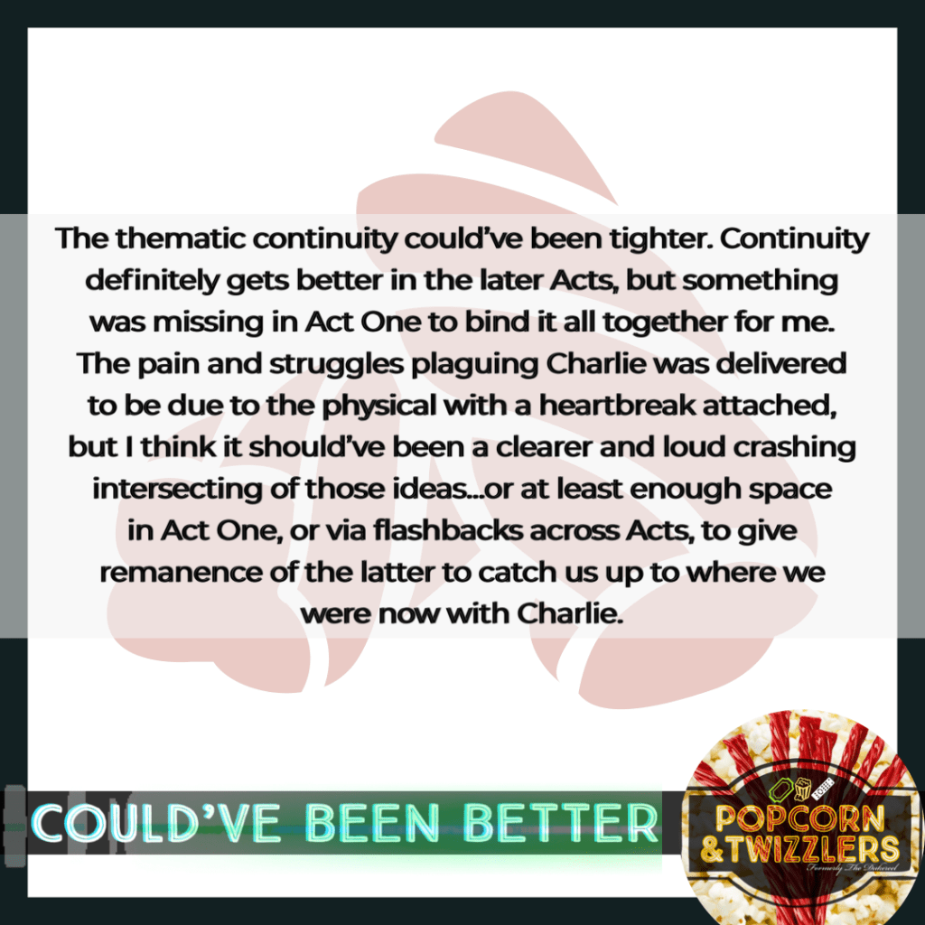 What could’ve used some work for me was some more thought for thematic cohesion in Act One, and in general when looking at character development. 🤷🏾♂️